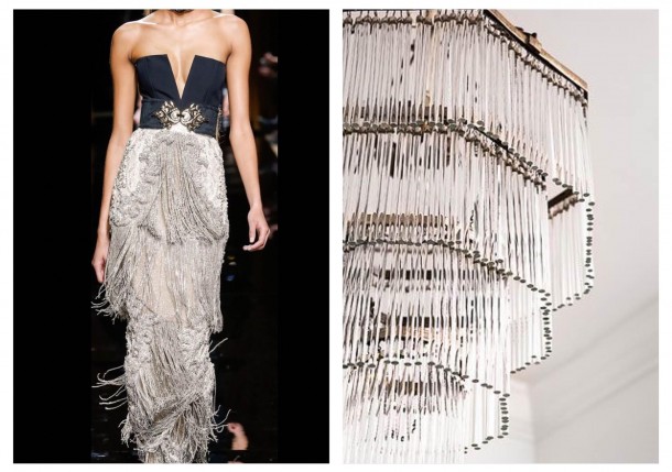 - A blooming designer Olivier Rousteing is now in charge of the fashion line Balmain. The intricate beading and structural elements to his designs have truly swept up the fashion world. This silver fringe tiered dress with black detailing is absolutely immaculate. This trend is beautifully mirrored in this fringe like crystal tiered chandelier that is breathtaking.