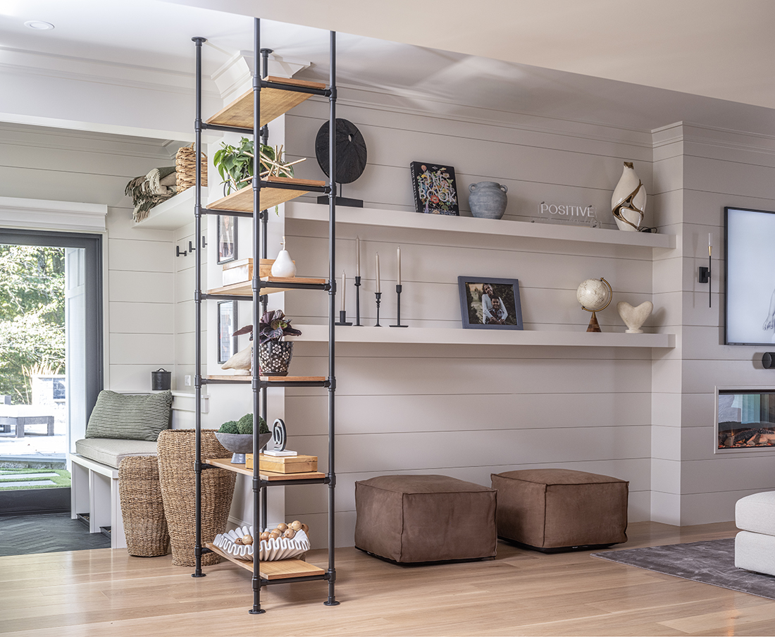 With a growing family our clients asked us to transform their basement level into a gathering space for the entire family to enjoy for years to come! The kids can grow, gather, enjoy friends and the adults can continue entertaining from the new entry area right to the walk out patio and living spaces.  After an active day of sports and working out in the out building, they can enjoy a steam shower with laundry and plenty of storage. A mini kitchenette with a nugget ice machine, beverage drawers and cooktop makes entertaining a breeze.  Mom asked for a room of her own to wrap gifts and stay organized and the entire family has a super large comfy sectional to enjoy family movie nights.